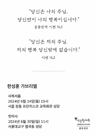 » 2024년 6월 사제서품식 안내 2024년 6월 24일 오후 3시 서울 정동 프란치스코 교육회관 1층 성당에서 작은형제회 소속 한성훈 가브리엘 부제의 사제서품식이 거행될 예정입니다. 많이 참석하... file 홈지기 2024.05.21 1681