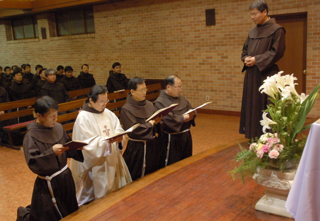 사진설명 : 관구봉사자 오상선 바오로 형제 앞에서 서원 갱신을 하는 모습입니다.